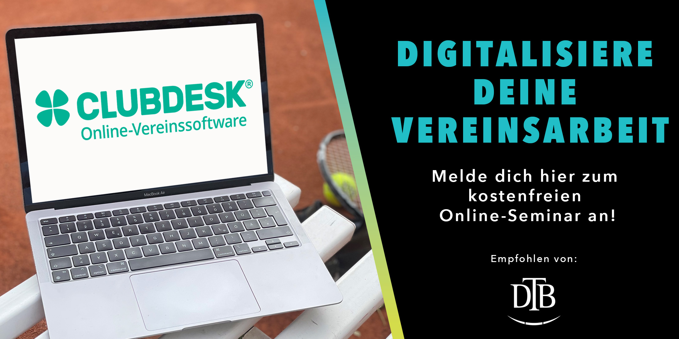 Der Deutsche Tennis Bund und ClubDesk laden dich zum kostenfreien Online-Webinar am Dienstag, den 7. Februar 2023 von 18:00 bis 19:00 Uhr ein.
