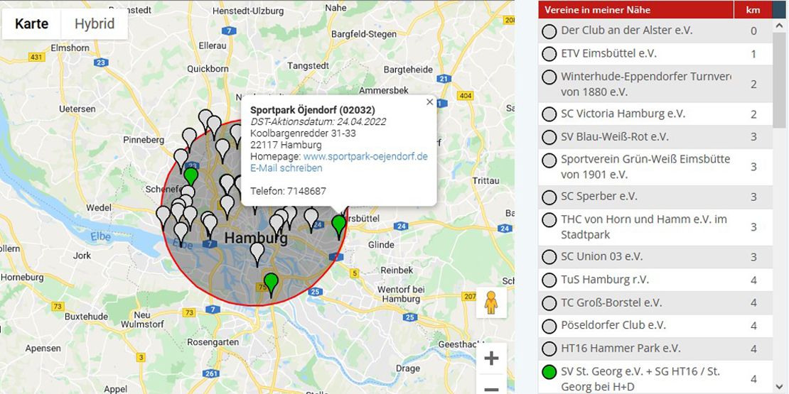 Alle Vereine, die sich für die Saisoneröffnung im Rahmen von Deutschland spielt Tennis registriert haben, werden auf der Landkarte grün markiert. Wenn der entsprechende Verein ausgewählt wird, erscheinen automatisch alle relevanten Daten zum Verein und zum Aktionstag (Adresse, Kontaktdaten, Homepage etc.)