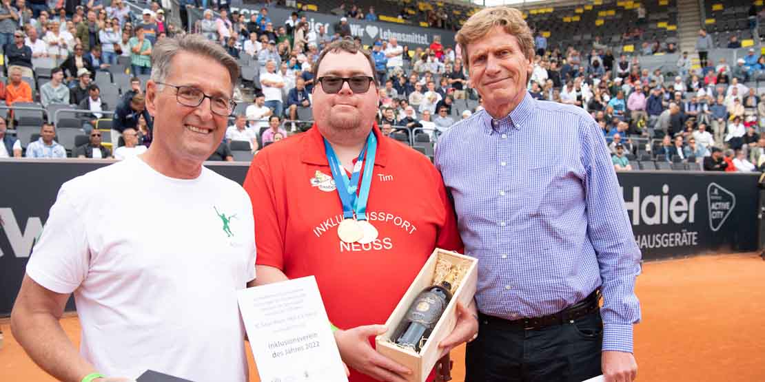Der Deutsche Tennis Bund (DTB) und die Gold-Kraemer-Stiftung haben im Rahmen des „Tennis für Alle“-Projektes zum ersten Mal den Award „DTB Inklusionsverein des Jahres“ verliehen. In Anerkennung besonderer Leistungen zur Förderung der Inklusion im Tennissport wurde der Preis dem TC Grün-Weiss 1963 Neuss im Rahmen der Hamburg European Open von DTB-Präsident Dietloff von Arnim überreicht. © Witters Teilen Gesucht wurden Tennisvereine, die die Teilhabe von Menschen mit Beeinträchtigung fördern, inklusive Trainings- und Wettkampfangebote anbieten und damit zu einem gelungenen inklusiven Vereinsleben beitragen. Der TC Grün-Weiss 1963 Neuss überzeugte die Fachjury um Dr. Sebastian Projahn (DTB-Vizepräsident Sportentwicklung), Dr. Volker Anneken (Geschäftsführer Gold-Kraemer-Stiftung), Niklas Höfken (DTB-Referent für Inklusion und Parasport und Projektleiter für Tennis für Alle in der Gold-Kraemer-Stiftung), Fabienne Bretz (DTB-Referatsleiterin Sportentwicklung) und Britta Wend (Rollstuhltennis Nationalmannschaft) mit seinem inklusiven Konzept. „Wir haben uns sehr über die vielfältigen Bewerbungen gefreut. Die Tennisvereine leisten einen wichtigen Beitrag zur Teilhabe von Menschen mit Beeinträchtigung im Tennissport. Wir gratulieren dem TC GW 1963 Neuss, der durch sein herausragendes Engagement und durch ein ganzjähriges Konzept zeigt, wie Inklusion nicht nur auf dem Platz, sondern im Tennisverein gelebt wird“, begründet Dr. Sebastian Projahn, DTB-Vizepräsident für Sportentwicklung, die Entscheidung. „Inklusion ist eine Bereicherung für alle Mitglieder" „Die Auszeichnung „Inklusionsverein des Jahres“ durch den DTB hat uns hier alle außerordentlich gefreut, insbesondere unsere Athlet:innen mit Beeinträchtigungen, ihre Trainer:innen, Betreuer:innen und ehrenamtliche Unterstützer:innen. Unser integratives und inklusives Vereinsmotto ‚Tennis spielen unter Freunden‘ wird bei uns im Verein umfassend gelebt und ist einer Bereicherung für alle Mitglieder“, freut sich der 1. Vereinsvorsitzende Michael Ritters, für den die Integration der Handicaps – wie sich die Gruppe selber nennt – bei allen Vereinsveranstaltungen hohe Priorität hat. Bereits 2005 begann die Geschichte der Inklusion im TC GW Neuss als sich 19 Menschen mit geistiger Beeinträchtigung dem Verein anschlossen. Seitdem ist Inklusion beim TC Grün-Weiss 1963 Neuss zur gelebten Selbstverständlichkeit geworden. Neben Spiel- und Trainingsangeboten sowie der Teilnahmemöglichkeit an Medenspielen und Veranstaltungen, richtet der Verein seit nunmehr zehn Jahren ein Inklusionsturnier auf seiner Anlage aus. Seit 2019 ist Inklusion sogar fest in der Vereinssatzung verankert.